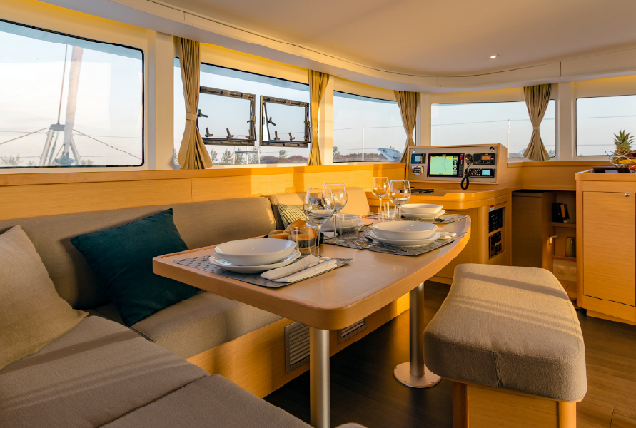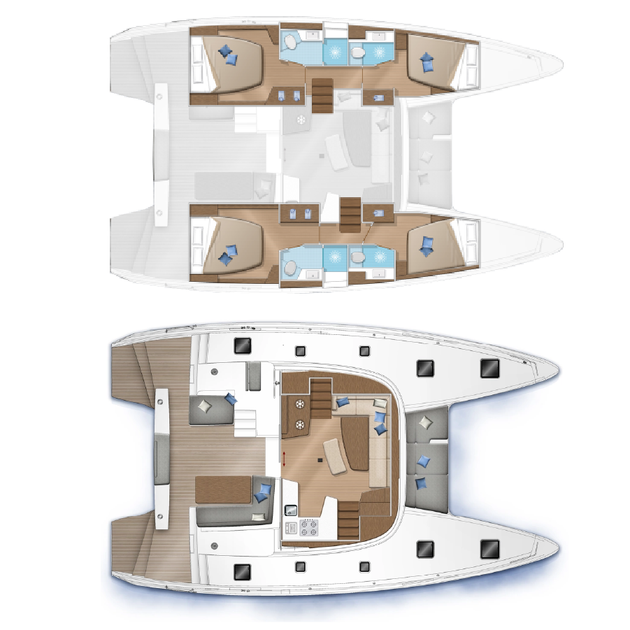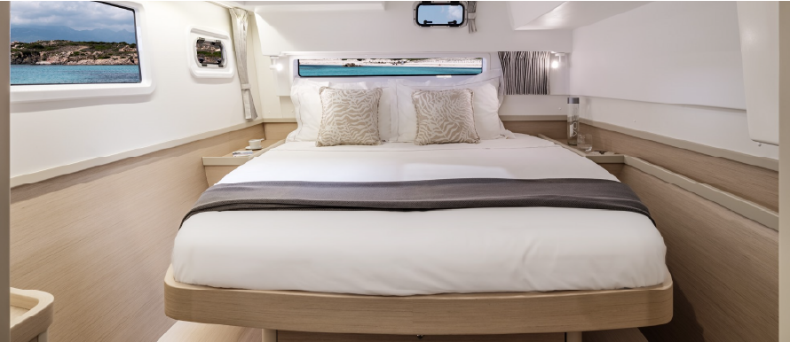 A catamaran designed for comfort, where every space invites you to unwind. The open-space saloon, bright and airy, is the perfect place to enjoy a book or simply take in the view, while the expansive outdoor areas allow you to soak up the sun in total serenity. The spacious and quiet cabins provide the ideal retreat for restful nights after a day on the water.