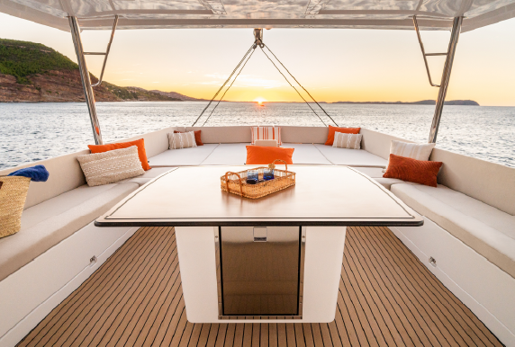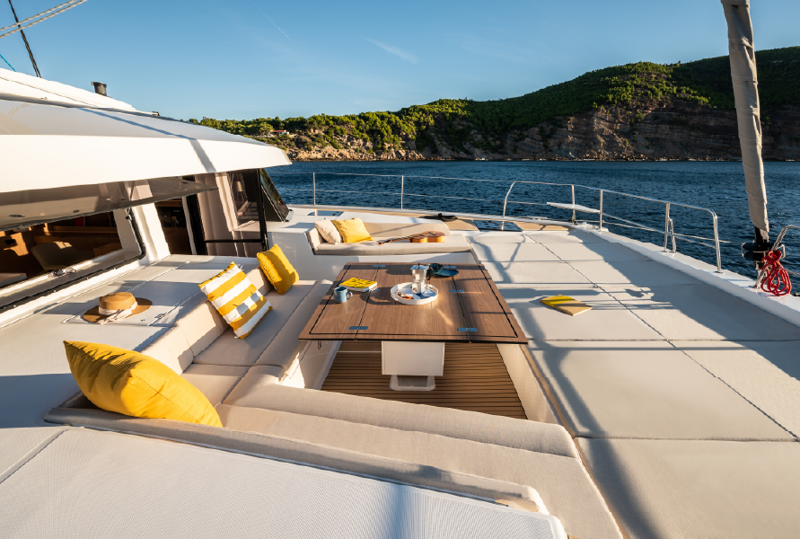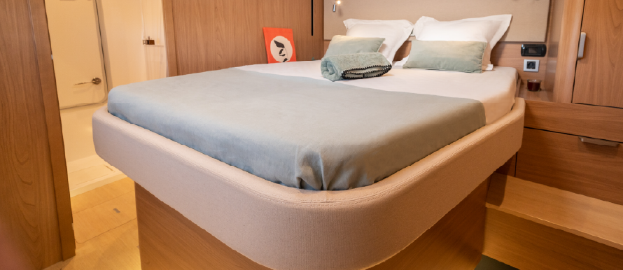 A catamaran designed for comfort, where every space invites you to unwind. The open-space saloon, bright and airy, is the perfect place to enjoy a book or simply take in the view, while the expansive outdoor areas allow you to soak up the sun in total serenity. The spacious and quiet cabins provide the ideal retreat for restful nights after a day on the water.