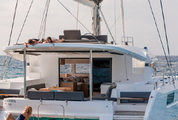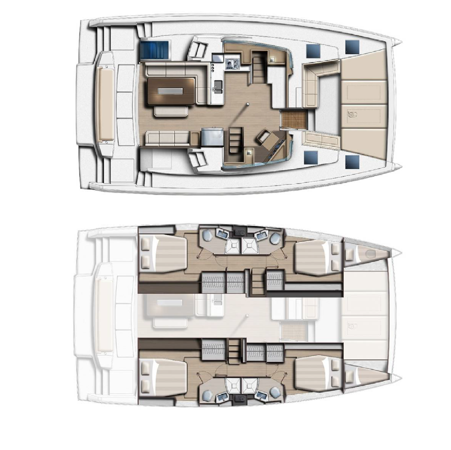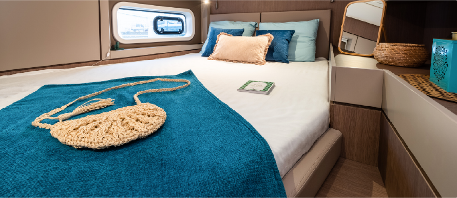 A catamaran designed for comfort, where every space invites you to unwind. The open-space saloon, bright and airy, is the perfect place to enjoy a book or simply take in the view, while the expansive outdoor areas allow you to soak up the sun in total serenity. The spacious and quiet cabins provide the ideal retreat for restful nights after a day on the water.