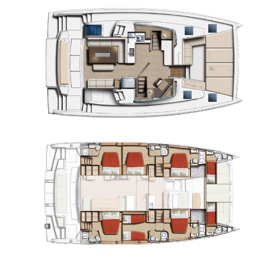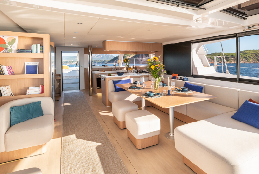 A catamaran designed for comfort, where every space invites you to unwind. The open-space saloon, bright and airy, is the perfect place to enjoy a book or simply take in the view, while the expansive outdoor areas allow you to soak up the sun in total serenity. The spacious and quiet cabins provide the ideal retreat for restful nights after a day on the water.