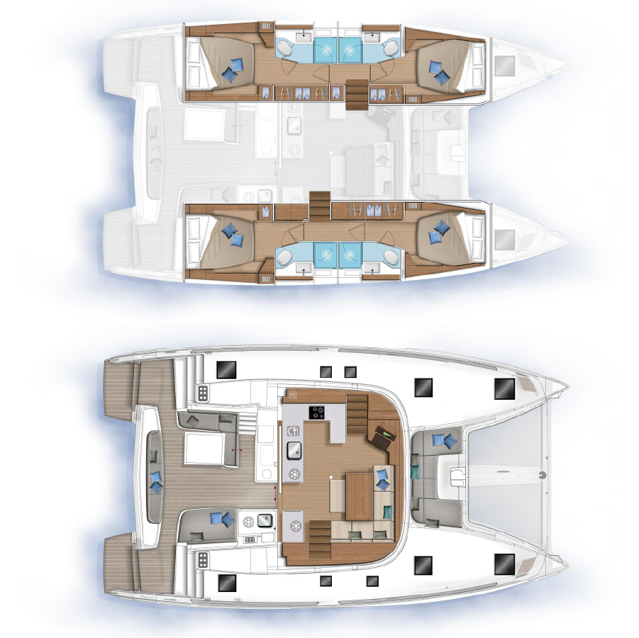 A catamaran designed for comfort, where every space invites you to unwind. The open-space saloon, bright and airy, is the perfect place to enjoy a book or simply take in the view, while the expansive outdoor areas allow you to soak up the sun in total serenity. The spacious and quiet cabins provide the ideal retreat for restful nights after a day on the water.