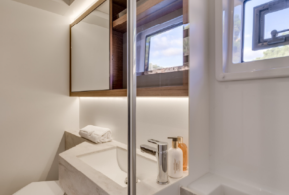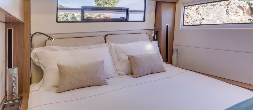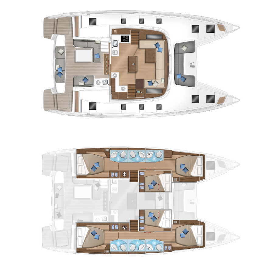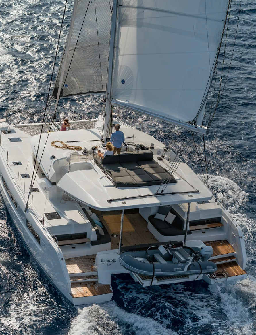 A catamaran designed for comfort, where every space invites you to unwind. The open-space saloon, bright and airy, is the perfect place to enjoy a book or simply take in the view, while the expansive outdoor areas allow you to soak up the sun in total serenity. The spacious and quiet cabins provide the ideal retreat for restful nights after a day on the water.